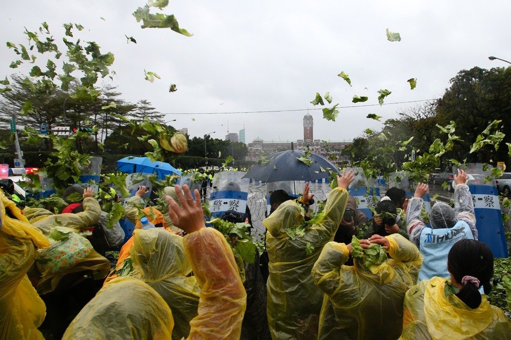 抗議群眾向向蔡辦投擲一堆“爛菜”,表達(dá)心中怒火。(圖片來(lái)源:臺(tái)灣《聯(lián)合報(bào)》)