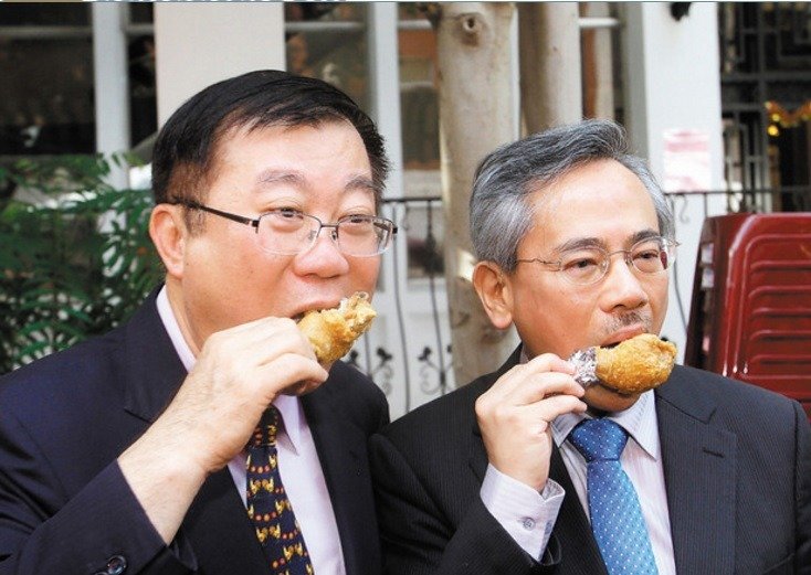 陳保基(左)和邱文達(右)擔任臺“農委會主委”、“衛生署署長”時,也曾公開大啃雞肉,來證明安全。(臺灣《聯合》報系資料圖)