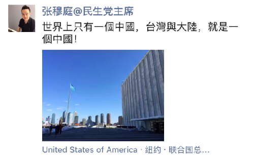 從3月12日開始,參考消息網(wǎng)-銳參考一直在與張穆庭保持著聯(lián)絡(luò),也發(fā)現(xiàn)這位38歲的臺灣年輕人在各種場合,宣揚(yáng)他的理念和立場。如3月17日上午,路過紐約的聯(lián)合國總部大樓時(shí),他抬手拍下一張照片發(fā)到朋友圈,配文道:世界上只有一個(gè)中國,臺灣與大陸,就是一個(gè)中國!