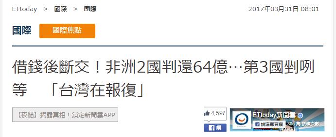 “臺灣在報復”,外媒一篇報道,讓臺媒頓感興奮,在標題打出這樣五個字眼。那么是什么“好事”呢?據臺灣“東森新聞云”援引路透社報道,臺灣的“中國輸出入銀行”和與臺“斷交”的3個非洲國家打官司,其中兩起勝訴,成功追討超過2.12億美元的未償還貸款。