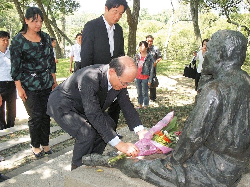 2011年,臺南市長賴清德陪同日本官員參拜八田與一銅像。(圖片來源:臺“聯合報”)