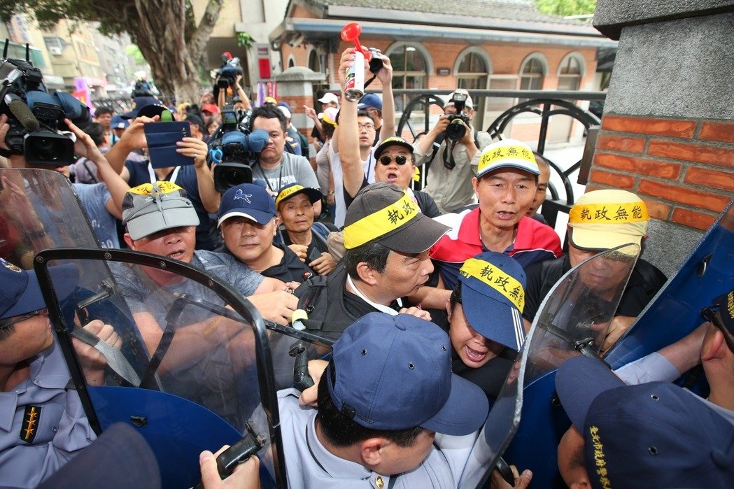 島內“監督年金改革行動聯盟”上午以人墻試圖阻擋“立院”各出入口,并與警方發生推擠沖突。(圖片來源:臺灣聯合新聞網)
