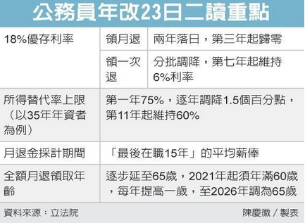 黨職并公職: 訂定“老年基本生活保障”,因黨職并公職年資而溢領的退休金,超出部分的黨職年資應該扣除;扣除黨職年資后未達退休年資,其退休金額度酌降。