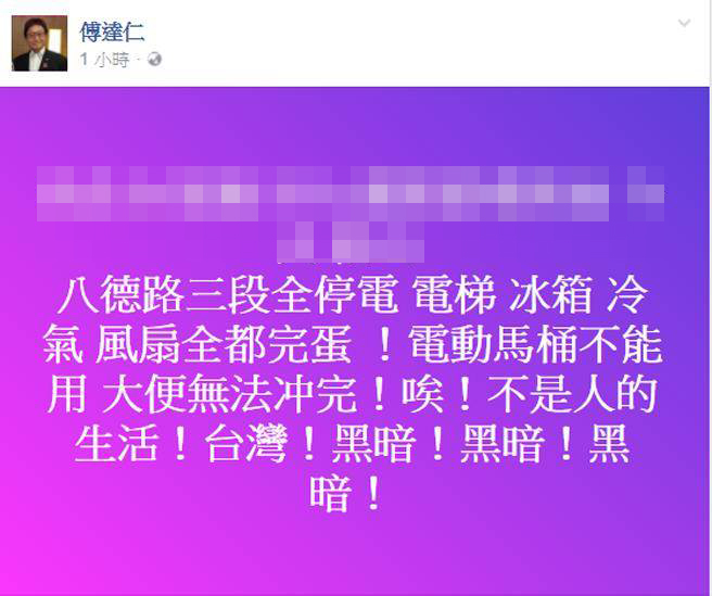 傅達仁借Facebook憤怒控訴停電給民眾帶來的不便。(網絡圖)