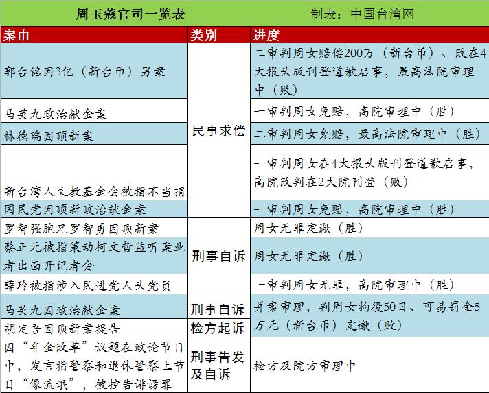 另周前年指前臺灣地區領導人馬英九捐助成立的“新臺灣人文教基金會”,坐擁10億元資產,是馬的競選金庫,遭基金會提告索賠,高院維持北院判決,認定周女的言論與事實不符,因考慮只有2家報紙轉載周的言論,判她在這2家報紙刊登啟事,現也在最高法院審理中。