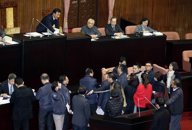 “立法院”9日臨時會處理“勞基法”部分條文修正草案,‘院長'蘇嘉全(上)進入議場后宣布進入廣泛討論,遭國民黨團上前抗議。(圖片來源:臺灣《中時電子報》)