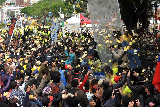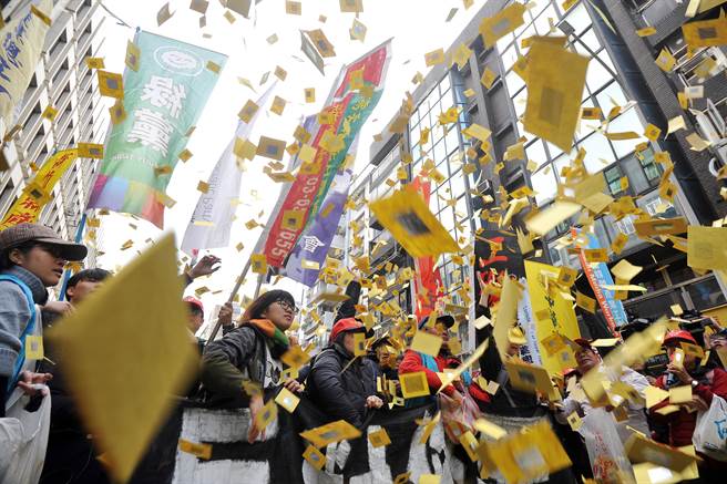 臺(tái)灣勞團(tuán)繞行“立法院”撒冥紙,表達(dá)不滿。(圖片來源:臺(tái)灣“中國時(shí)報(bào)”)