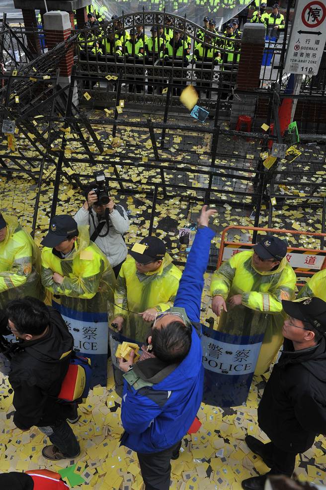 臺(tái)灣“立法院”三讀通過“勞基法”修正案,場(chǎng)外抗議的勞團(tuán)成員繞行“立法院”撒冥紙,而警員們則排成人墻警戒。(圖片來源:臺(tái)灣“中國時(shí)報(bào)”)
