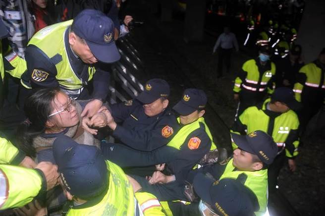 桃園市產業總工會8日傍晚發出“臥軌宣言”,到臺北車站第三南下月臺發動激烈的臥軌抗爭,他們表示別無選擇只能臥軌抗爭。警方三度舉牌后,目前正逐漸把臥軌的抗議民眾一一逮捕。(圖片來源:臺灣“中國時報”)