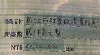 每年農(nóng)歷年前,一位善心人士都以“無名氏”名義捐2千萬給新北市。(圖片來源:臺灣《聯(lián)合報》)