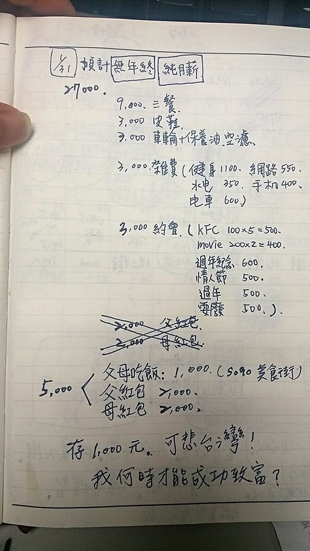 在王男公開的1月份預估收支表中,大略記下主要花費,包括三餐9000元、皮鞋3000元、汽車保養(yǎng)3000元(車輪、保養(yǎng)油等)、雜費3000元(健身、網絡、手機等)、約會3000元(吃肯德基、看電影等)、父母紅包5000元,加一加得花26000元,難怪他無奈又憤怒寫下,“存1000元,可悲臺灣!我何時才能成功致富?”