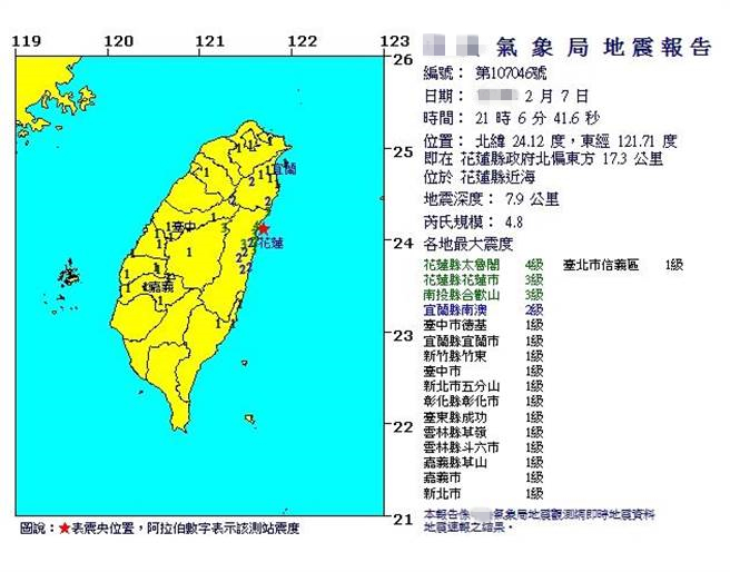 21時(shí)06分,花蓮縣近海發(fā)生規(guī)模4.8級(jí)有感地震,深度7.9公里,花蓮最大震度4級(jí)、宜蘭2級(jí)。(圖片來(lái)源:臺(tái)灣《中時(shí)電子報(bào)》)