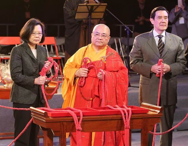 馬英九蔡英文同臺敲鐘祈福。(圖片來源:臺灣《中時電子報》)