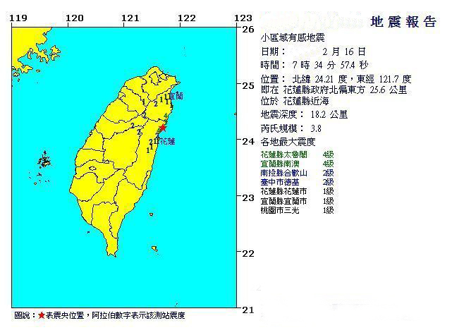 據(jù)臺(tái)灣聯(lián)合新聞網(wǎng)報(bào)道,臺(tái)氣象部門發(fā)布地震報(bào)告顯示,今天(16日)上午7時(shí)34分,在花蓮縣近海(花蓮縣政府北偏東方25.6公里),發(fā)生3.8級(jí)有感地震,地震深度18.2公里。最大震度:花蓮縣4級(jí)、宜蘭縣4級(jí)、南投縣2級(jí)、臺(tái)中市2級(jí)、桃園市1級(jí)。