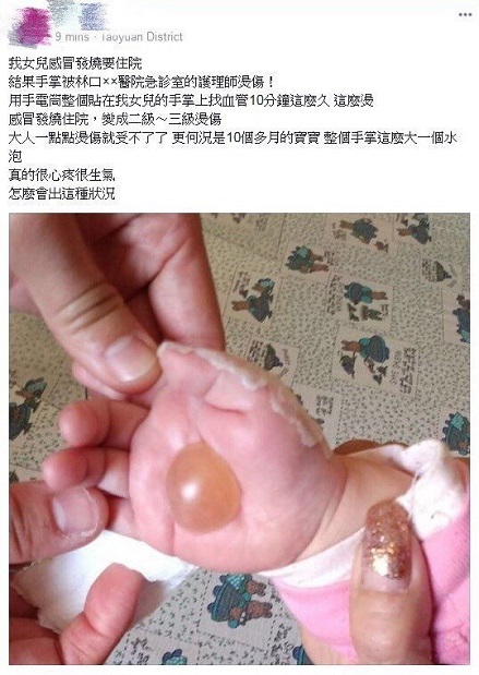 網(wǎng)友指稱,十月大女兒因感冒發(fā)燒前往林口某醫(yī)院住院治療,護(hù)理師為了找尋女嬰手上血管,使用手電筒貼在女嬰手上長達(dá)十分鐘,導(dǎo)致女童二到三級燒燙傷,手掌上更起了一個巨大的水泡,網(wǎng)友憤怒發(fā)文“怎么會出現(xiàn)這種狀況?”