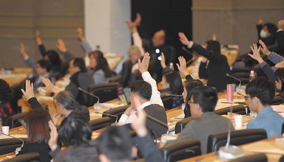 臺大臨時校務會議24日召開,出席的委員現場針對投票是否記名進行舉手表決。(季志翔攝)