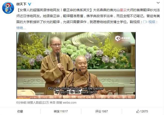 星云法師女弟子妙光的口譯片段,引發網友討論話題。(圖片來源:臺灣“中時電子報”)