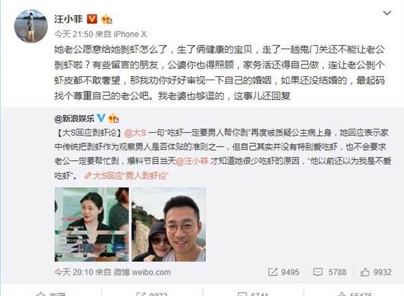 大S被質疑,向來寵妻入骨的汪小菲自然萬般不舍,早前更在微博寫下百字文力挺愛妻:“她老公愿意給她剝蝦怎么了,生了倆健康的寶貝,走了一趟鬼門關還不能讓老公剝蝦啦?有些留言的朋友,公婆你也得照顧,家務活還得自己做,連讓老公剝個蝦皮都不敢奢望,那我勸你好好審視一下自己的婚姻,如果還沒結婚的,最起碼找個尊重自己的老公吧。我老婆也夠逗的,這事兒還回復。”