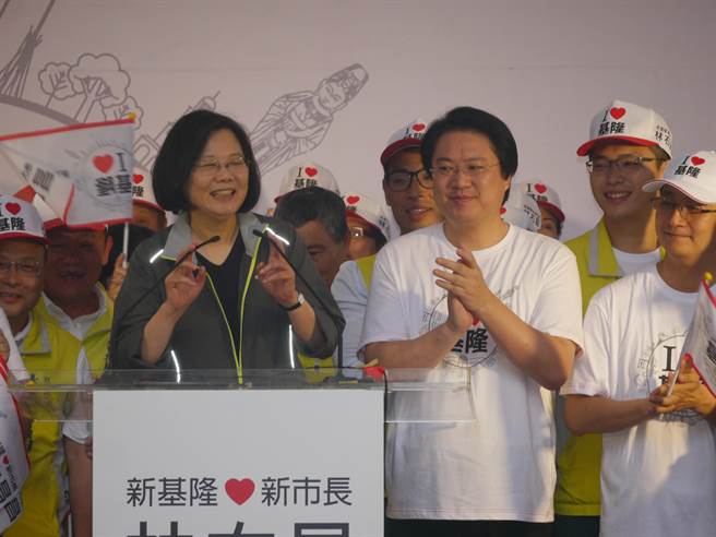 蔡英文(左)今日上午出席基隆市長林右昌競選總部成立大會,為林右昌(右)站臺。(圖片來源:臺灣“中時電子報”)