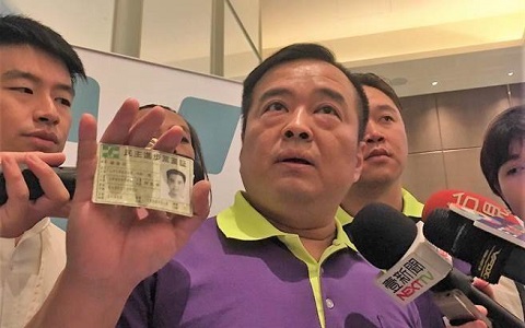 臺北市家長會長團體聯(lián)盟總會長謝俊洲昨天拿著黨證嗆民進黨“當人民是狗嗎” (圖片來自臺媒)