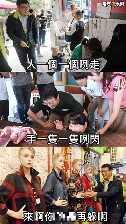 臉譜網(wǎng)粉絲專(zhuān)頁(yè)“老天鵝娛樂(lè)”也PO出一張圖,并且搞笑加注旁白,因?yàn)榍懊娴娜硕奸W躲避開(kāi)握手,所以打趣姚文智與假人握手的行為,是因?yàn)檫@樣這些“假人”躲不開(kāi)了。“老天鵝娛樂(lè)”也開(kāi)酸:“文智已經(jīng)放棄治療了”。