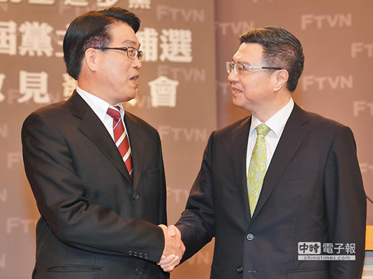 民進(jìn)黨第16屆黨主席補(bǔ)選電視政見發(fā)表會(huì)4日舉行,前臺(tái)當(dāng)局“行政院秘書長(zhǎng)”卓榮泰(右)與“臺(tái)灣民意基金會(huì)”董事長(zhǎng)游盈隆(左)會(huì)前相互握手致意。(圖片來源:臺(tái)灣“中時(shí)電子報(bào)”)