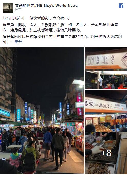 陳文茜日前在臉譜網發出逛六合夜市的數張照片,對烤烏魚子、炒烏魚鰾與海鮮咸粥等小吃贊不絕口,除了遺憾胃太小、無法把各種美味嘗遍,也直言“這條街本來值得人潮洶涌”。