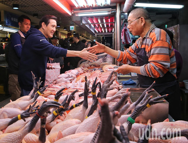 馬英九(左)今天到興隆市場買菜,并發(fā)放春聯(lián)給攤商與買菜民眾。(圖片來源:臺灣《聯(lián)合報》)
