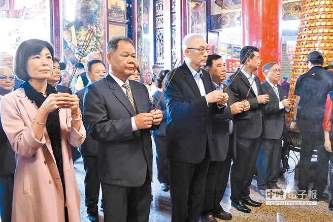 國民黨主席吳敦義(左三)大年初三在家鄉南投縣草屯鎮敦和宮上香,并談及黨內初選機制。(圖片來源:臺灣”中時電子報“)