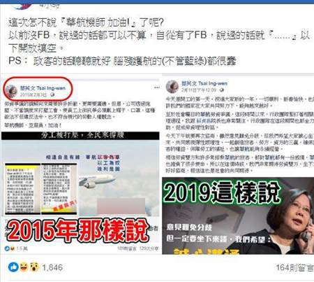 有網友在臉譜網不公開社團“爆政公社”分享兩張蔡英文臉譜網截圖,一張是2015年華航機師醞釀罷工時,蔡英文力挺,還喊“機師、空服員加油”,一張是2019年2月11日華航機師罷工進入第4天時,蔡英文遭質疑神隱后首度談話,希望勞資雙方誠心坐下來協商,創造三贏。該網友說,蔡英文這次怎么不說“華航機師加油”了呢?以前沒有臉譜網,說過的話都可以不算,自從有了臉譜網,說過的話就“……”以下開放填空,還說政客的話聽聽就好,腦殘護航的都很蠢。