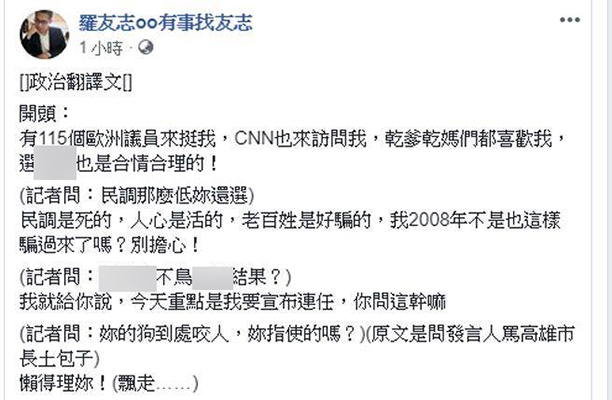 羅友志臉譜網(wǎng)發(fā)文。(圖片取自臺(tái)媒)