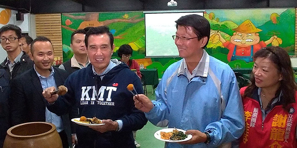 臺南市“立委”候選人謝龍介今日(11日)與馬英九一起參訪瓜瓜園,品嘗地瓜料理。(圖片來源:臺灣《聯(lián)合報》)