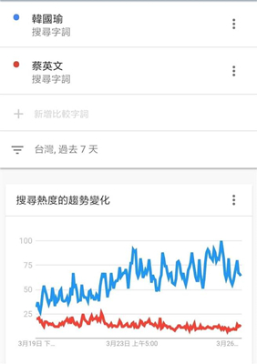 中國臺灣網(wǎng)3月28日訊 據(jù)臺灣“中時電子報”報道,前臺當(dāng)局“行政院院長”賴清德日前宣布參加民進黨內(nèi)2020提名初選,正式向蔡英文下挑戰(zhàn)書!臺灣民調(diào)顯示,賴無論看好度還是民進黨認同者支持度,均碾壓蔡。此外,有臺網(wǎng)友貼出搜尋熱度趨勢圖,表示,好憂傷,明明都是“出訪”為啥越打韓(韓國瑜)自己(蔡英文)聲量越低,人家卻不斷上漲呢?