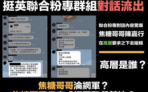 中國臺灣網(wǎng)4月4日訊 據(jù)臺灣“東森新聞云”報道,粉絲專頁“清出于南”日前貼出一張挺英聯(lián)合粉絲專頁的Line群組對話,指出藝人焦糖哥哥陳嘉行接獲“高層”指示,授意他到賴清德臉書留言質(zhì)疑賴清德,引發(fā)網(wǎng)友諸多討論,“對話中的高層是誰?”
