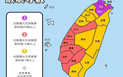 “古跡破壞制縣等級圖”開發(fā)程度越高的城市毀壞等級也越高,其中以臺北市、新北市最為嚴重。(圖片來自臺媒)