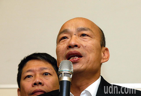 高雄市長韓國瑜訪美結束在桃園機場接受訪問時表示,郭臺銘是藍軍不可多得的人才,對他參選2020表示很開心。(圖片來源:臺灣《聯合報》)