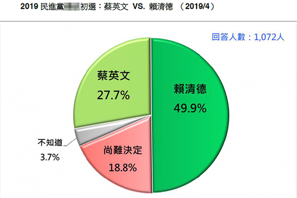 中國臺灣網4月21日訊 據臺灣“中時電子報”報道,民進黨2020黨內初選延至5月底,“臺灣民意基金會”今天(21日)公布最新民調,蔡英文若與賴清德直球對決,有27.7%民眾支持蔡英文,49.9%支持賴清德,兩人差距達22個百分點。“基金會”董事長游盈隆表示,這是一個一面倒的狀況,賴清德具有壓倒性的優勢。