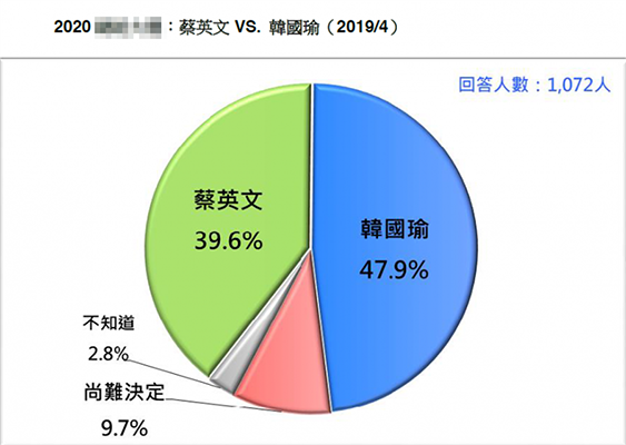 藍(lán)綠對決,韓國瑜以47.9%支持度贏過蔡英文的39.6%。(圖片取自臺媒)