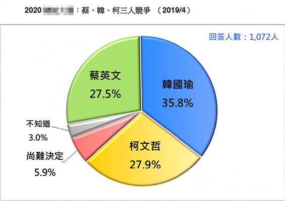 民進(jìn)黨若由蔡英文披戰(zhàn)袍,韓國瑜將以35.8%的民調(diào)支持度一支獨(dú)秀,領(lǐng)先柯文哲的27.9%及蔡英文的27.5%。(圖片取自臺媒)