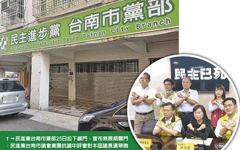 民進黨臺南市黨部25日拉下鐵門,宣布無限期關門。民進黨臺南市議會黨團抗議中評會對本屆議長選舉跑票議員輕罰停權1年半,痛批“民主已死”。(圖片來自臺媒)