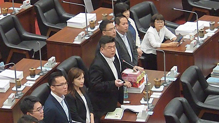 民進黨高市議員簡煥宗6日質詢時淚灑議場,指控韓粉揚言對其孩子不利(圖片來源:臺灣“中時電子報”)