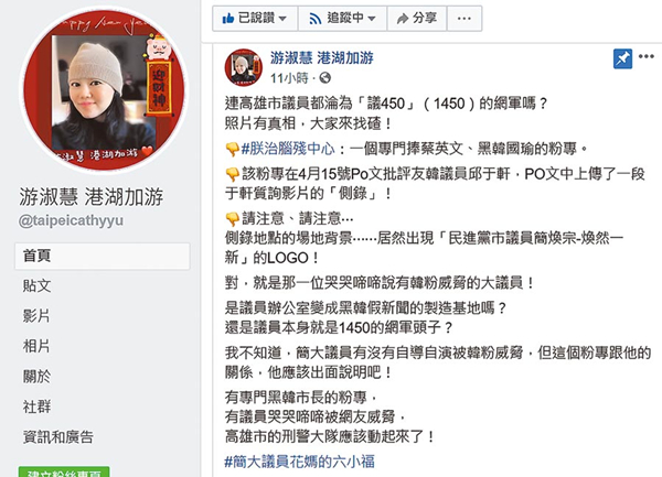 中國臺灣網5月8日訊 據臺灣《聯合報》報道,國民黨臺北市議員游淑慧昨天(7日)上午踢爆黑韓粉絲專頁“朕治腦殘中心”竟出現民進黨議員簡煥宗的LOGO后,她進一步在臉譜網(Facebook)貼文,用三張圖質疑“黑韓者聯盟”。