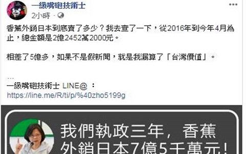 一級(jí)嘴炮技術(shù)士在臉書(shū)上打臉蔡英文,他說(shuō),“香蕉外銷日本到底賣了多少?他去查了一下,從2016年到今年4月為止,總金額是2億2452萬(wàn)2000元”。一級(jí)嘴炮技術(shù)士制作一圖諷刺,相差5億多,如果不是假新聞,就是他漏算了“臺(tái)灣價(jià)值”。