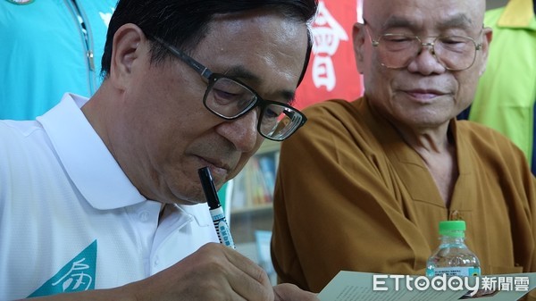 陳水扁6日出席高雄加場簽書會,扁子陳致中聲稱有助病情改善。(圖片來源:臺灣“東森新聞云”)