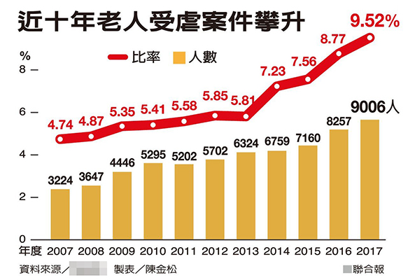 臺灣2007-2017老人受虐案不斷攀升。(圖片來源:臺灣《聯合報》)