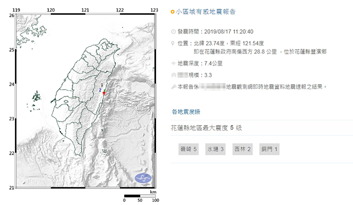 今天上午11時(shí)20分,在花蓮縣政府南偏西方28.8公里處發(fā)生里氏規(guī)模3.3級(jí)有感地震。(圖片取自臺(tái)媒)