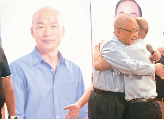 韓國瑜與吳敦義合體,相互擁抱,用行動突破“換瑜說”(圖片來源:臺灣《聯合報》)