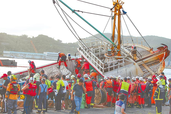 宜蘭縣南方澳跨港大橋1日驚傳坍塌意外,漁船遭壓并疑似還有多名外籍員工受困,臺海軍駁船將受困船只拉出,在救難人員協力下,將船只拉靠岸,救援人員隨即進入搜救。(圖片來源:臺灣“中時電子報”)