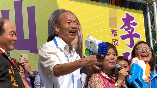 韓國(guó)瑜1日為黨籍鳳山“立委”參選人李雅靜站臺(tái),現(xiàn)場(chǎng)準(zhǔn)備水槍,反諷民進(jìn)黨撿到槍,要把韓國(guó)瑜身上的黑洗掉。(圖片來(lái)源:臺(tái)灣“中時(shí)電子報(bào)”)