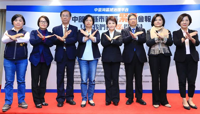 臺中市長盧秀燕(左五)3日號召中部7縣市首長向臺當(dāng)局發(fā)出怒吼,要求落實減煤!(圖片來源:臺灣“中時電子報”)